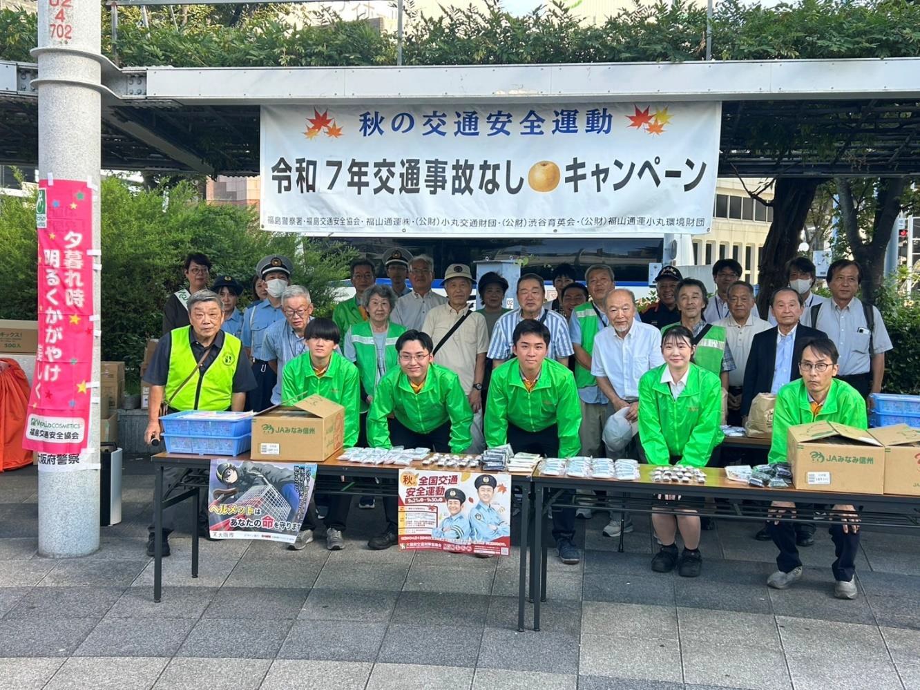 Fukuyama Transporting Co., Ltd. and the Komaru Koutsu Foundation held gTraffic Accident-Free (Jiko-Nashi) Campaignh on September 22 at the square in front of Noda Hanshin Station in Fukushima-ku, Osaka City. This event was organized as part of the national Autumn Traffic Safety Campaign, in cooperation with the Osaka Prefectural Fukushima Police Station and the Fukushima Traffic Safety Association. It marks the eighth time the campaign has been held in Osaka City.
