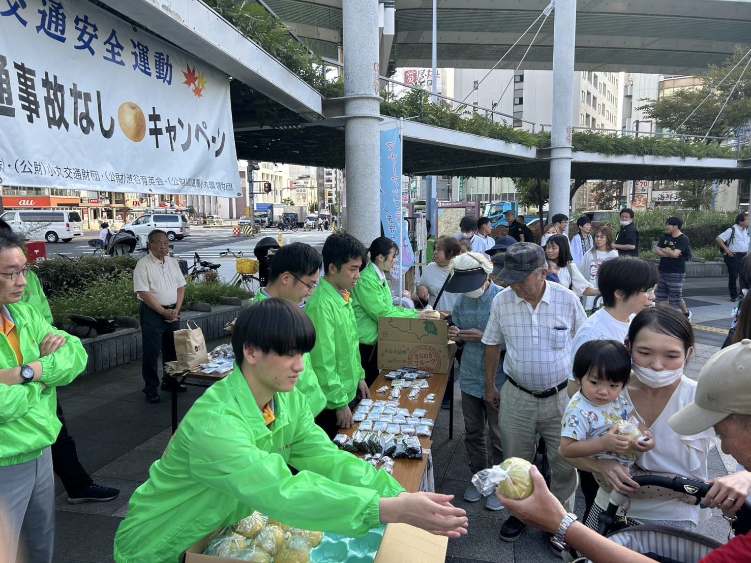 The Autumn Traffic Safety Campaign is a nationwide initiative designed to raise public awareness of traffic safety, promote compliance with traffic laws, and encourage responsible road behavior to help prevent accidents. During the event, 200 pears were distributed?symbolizing the wish for gzero accidentsh (as the Japanese word for pear, nashi, also means gnoneh)?alongside traffic safety-themed goods. The campaign team engaged directly with commuters and students to promote safer traffic habits.