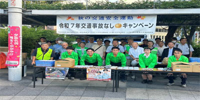 Fukuyama Transporting Co., Ltd. and the Komaru Koutsu Foundation held “Traffic Accident-Free (Jiko-Nashi) Campaign” on September 22 at the square in front of Noda Hanshin Station in Fukushima-ku, Osaka City. This event was organized as part of the national Autumn Traffic Safety Campaign, in cooperation with the Osaka Prefectural Fukushima Police Station and the Fukushima Traffic Safety Association. It marks the eighth time the campaign has been held in Osaka City.