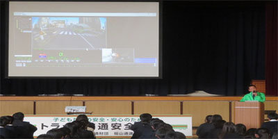 Fukuyama Transporting Co., Ltd. and Public Interest Incorporated Foundation Komaru Koutsu Foundation held a traffic safety class for 110 students of Fukuyama Municipal Kanae Elementary School in Hiroshima Prefecture on November 12.