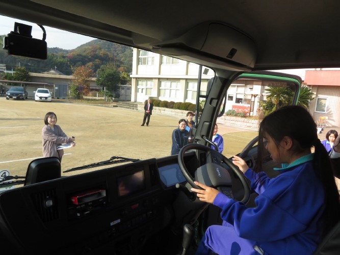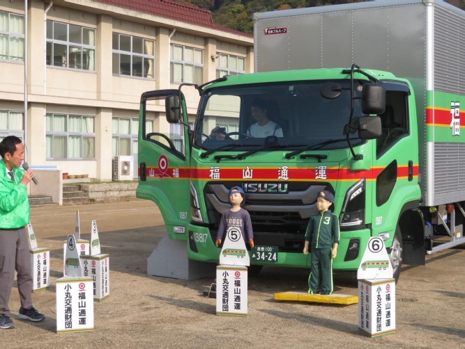 Fukuyama Transporting Co., Ltd. and Public Interest Incorporated Foundation Komaru Koutsu Foundation held a traffic safety class for 19 students of Kasaoka Municipal Konoshimasoto Junior High School in Okayama Prefecture on November 26.