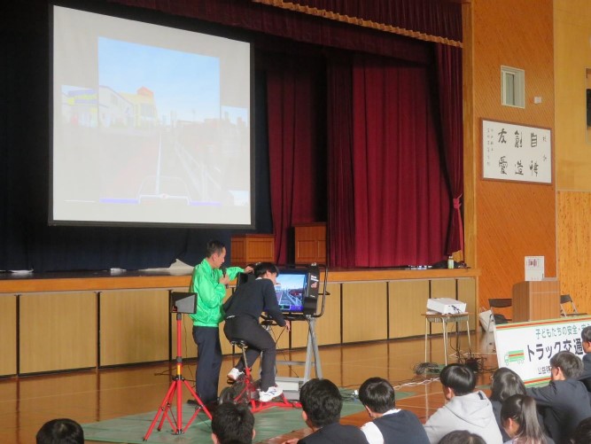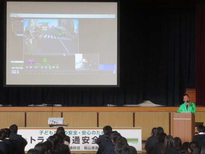 Fukuyama Transporting Co., Ltd. and the Komaru Koutsu Foundation conducted a traffic safety seminar for 408 students at Okayama Prefectural Kasaoka High School on November 7.