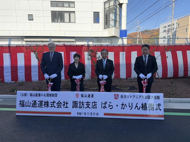 Fukuyama Transporting Co., Ltd. (Head Office: Fukuyama City, Hiroshima Prefecture, President: Hiroyuki Kumano) and Public Interest Incorporated Foundation Fukuyama Transporting Komaru Environmental Foundation (Location: Fukuyama City, Hiroshima Prefecture, Chief Director: Shigehiro Komaru) held a tree-planting ceremony at its new Suwa Branch in Nagano Prefecture on November 21. As part of the environmental initiatives, they planted Rose and Chinese quince saplings of "Fukuyama City of Roses."