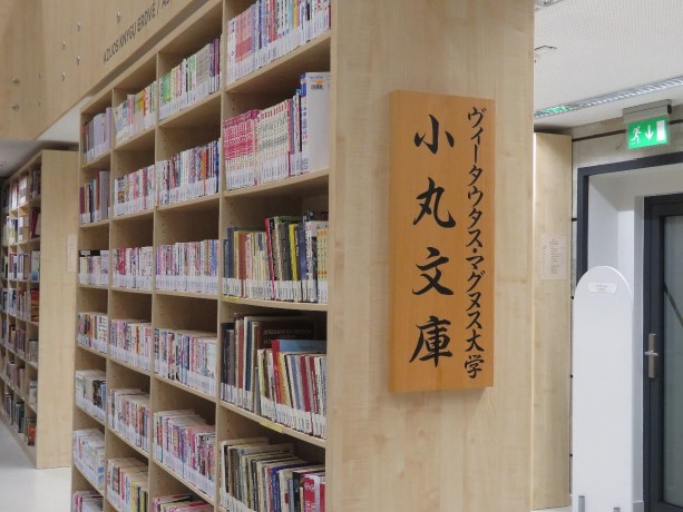 Fukuyama Transporting Co., Ltd. (Head office: Fukuyama City, Hiroshima Prefecture; Chairman: Shigehiro Komaru) and Public Interest Incorporated Foundation Komaru Koutsu Foundation (Chief Director: Shigehiro Komaru) held a Japanese book donation ceremony at the Komaru Library of Vytautas Magnus University in Lithuania on December 12. Since the library’s establishment in 2019, we have donated approximately 800 Japanese books in support of Japanese language education.